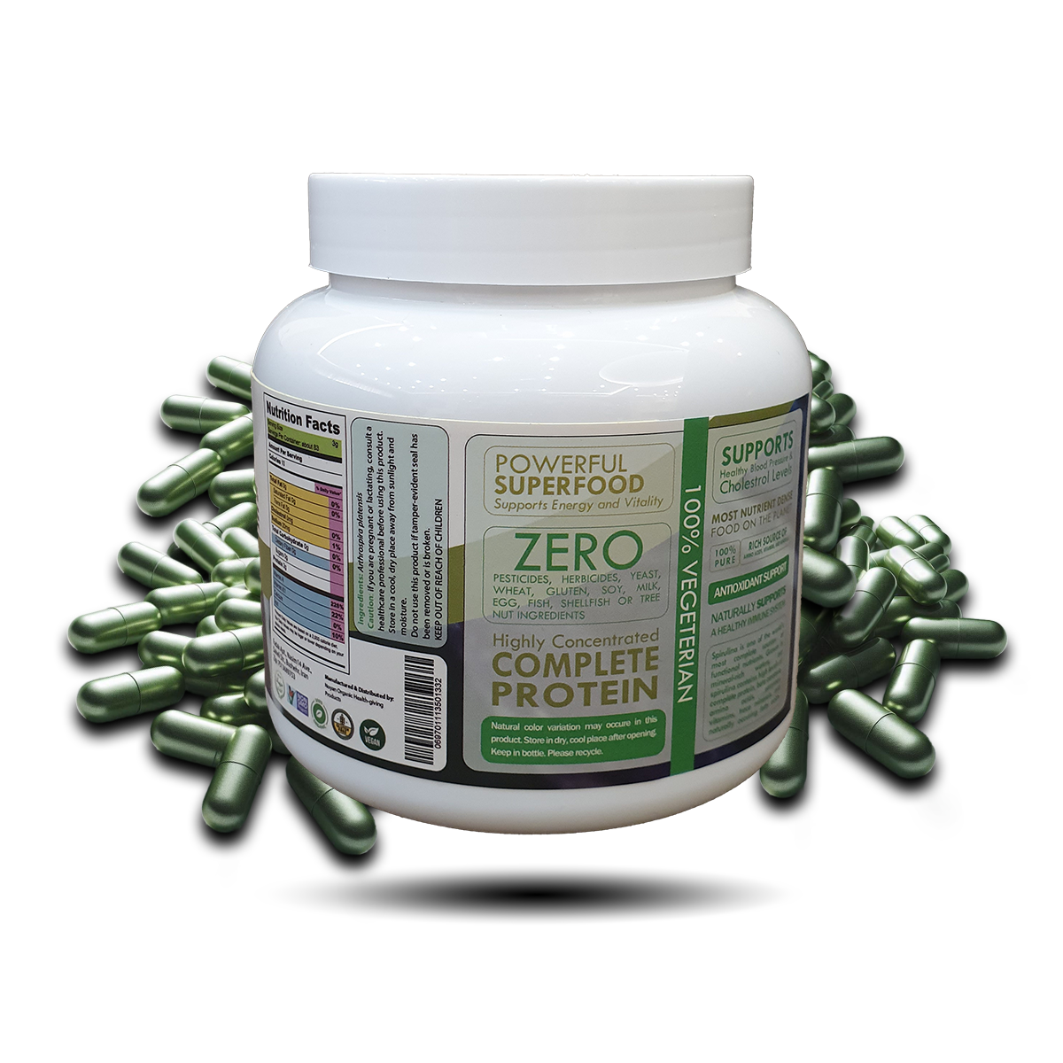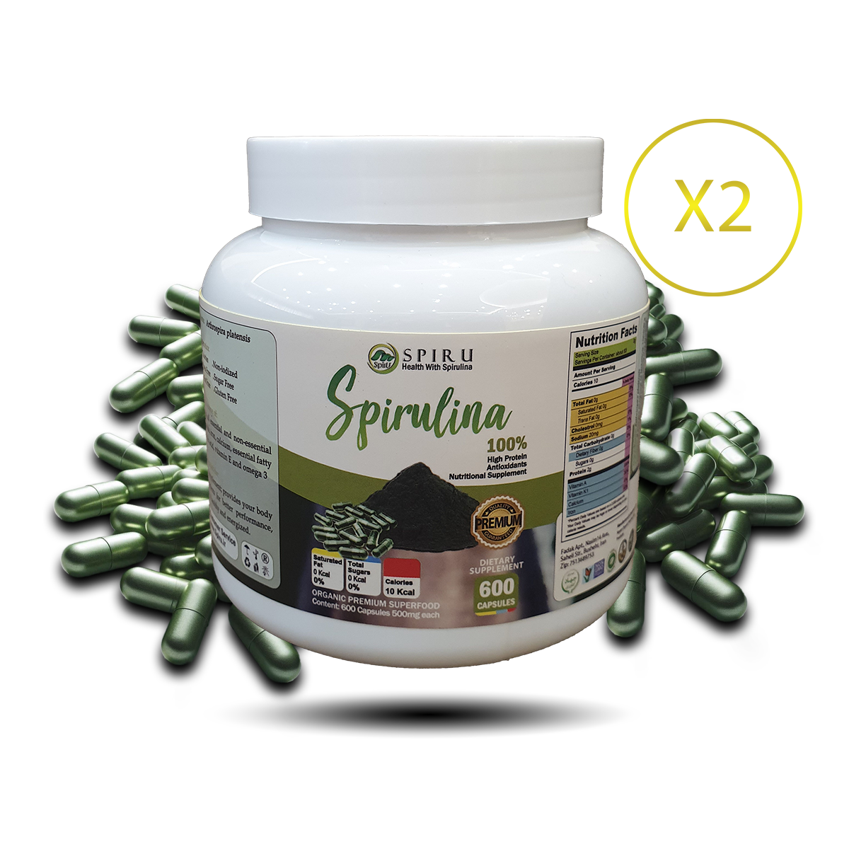 | محتویات | پودر خالص اسپیرولینا, کپسول ژلاتینی |